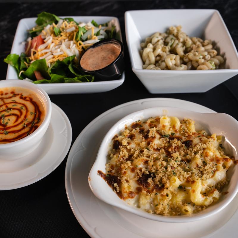 Fries | Homemade cup of soup | Signature macaroni salad | Artisan white cheddar macaroni and cheese +$2.99 upcharge